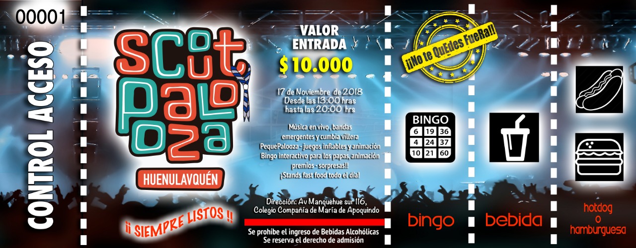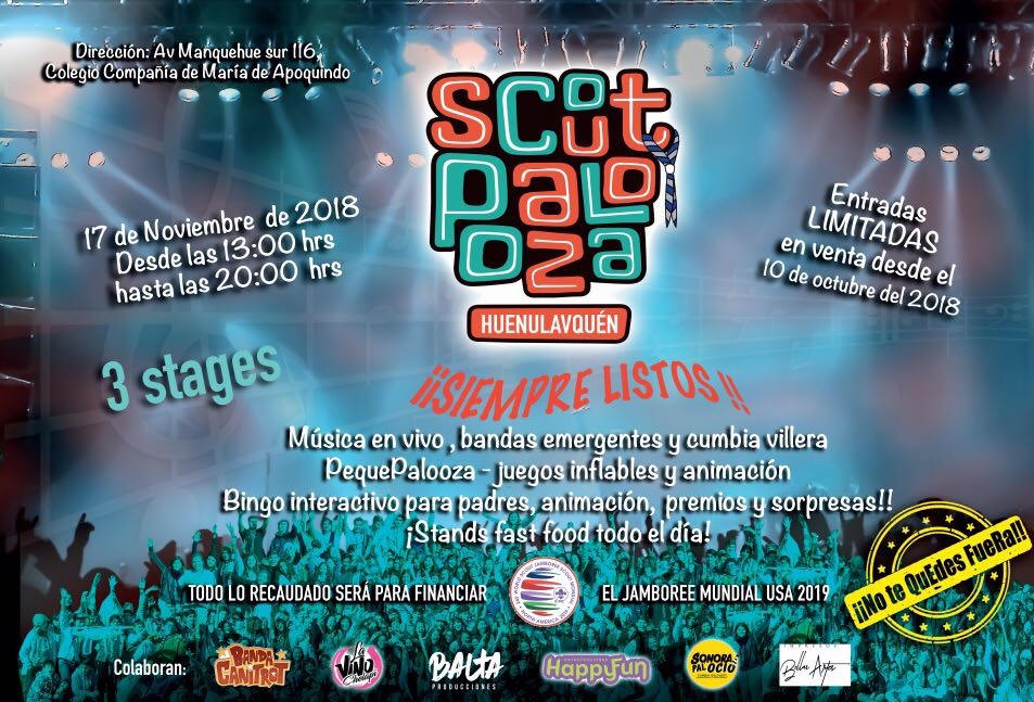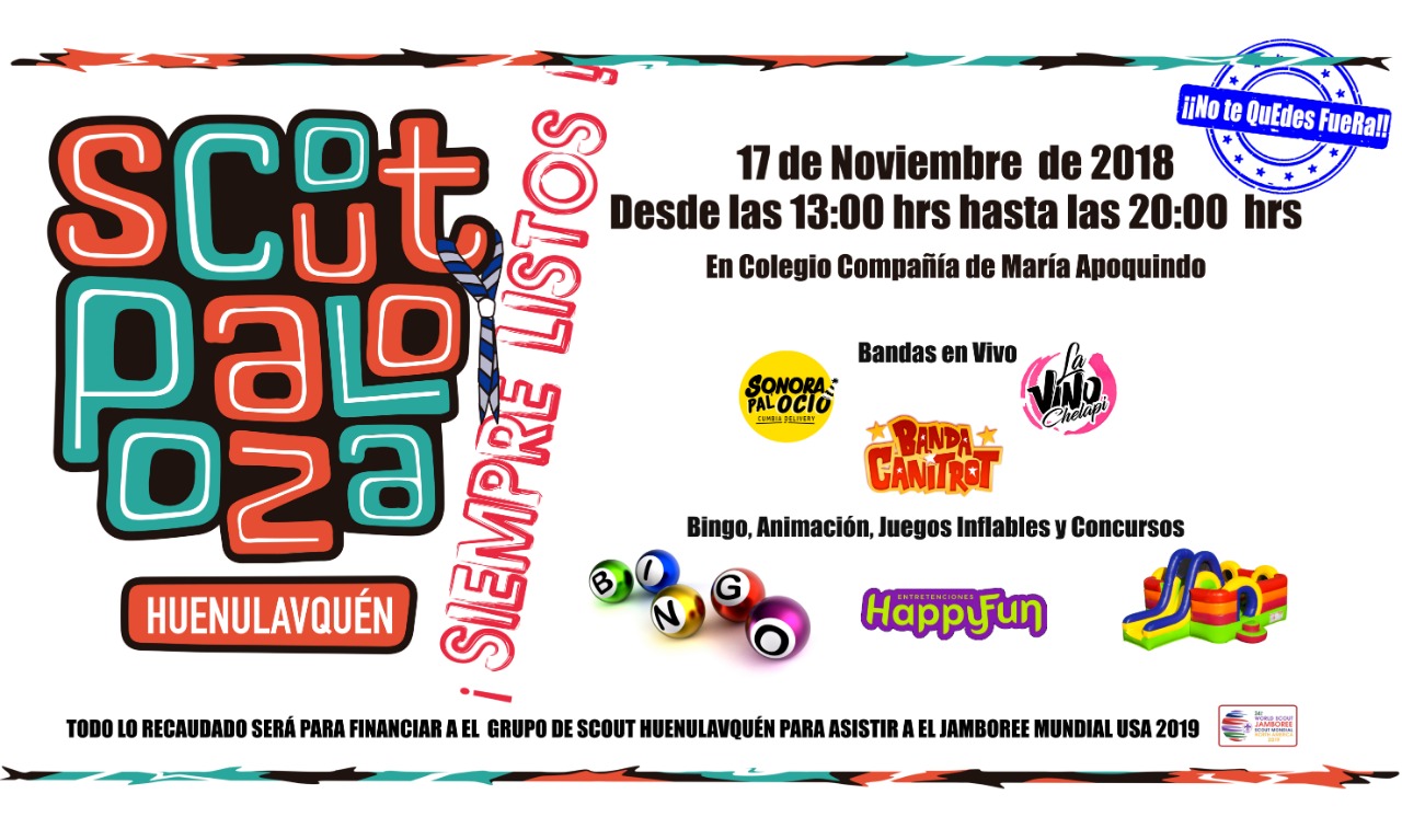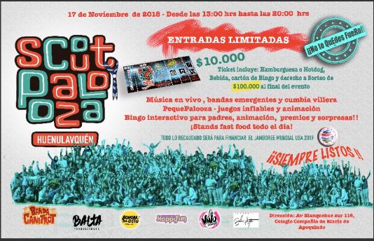 El sábado 17 de noviembre el grupo Scout Huenulavquén (nombre del grupo de nuestro colegio) ha organizado un evento musical familiar que contará con diferentes grupos musicales, stand de comida y diferentes actividades recreacionales : desde las 13,00 hrs del 17 de Noviembre.