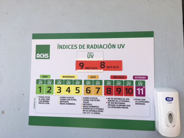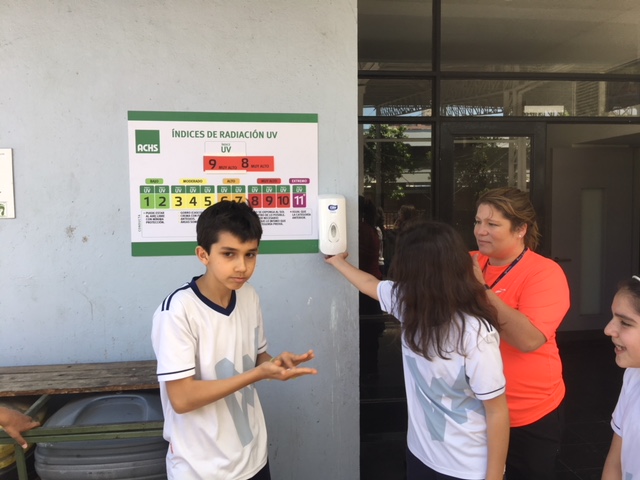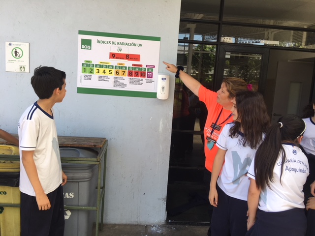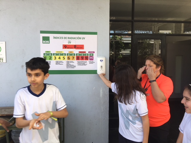 Hace unas semanas se instaló en los patios del colegio un afiche permanente con Indicadores de riesgo de rayos UV y dispensadores de Bloqueador Solar. Este indicador es actualizado, diariamente. Además , de una campaña en clases de Ed. Física que les enseña a distinguir los días críticos y usar -permanentemente – en esta época bloquedor solar.